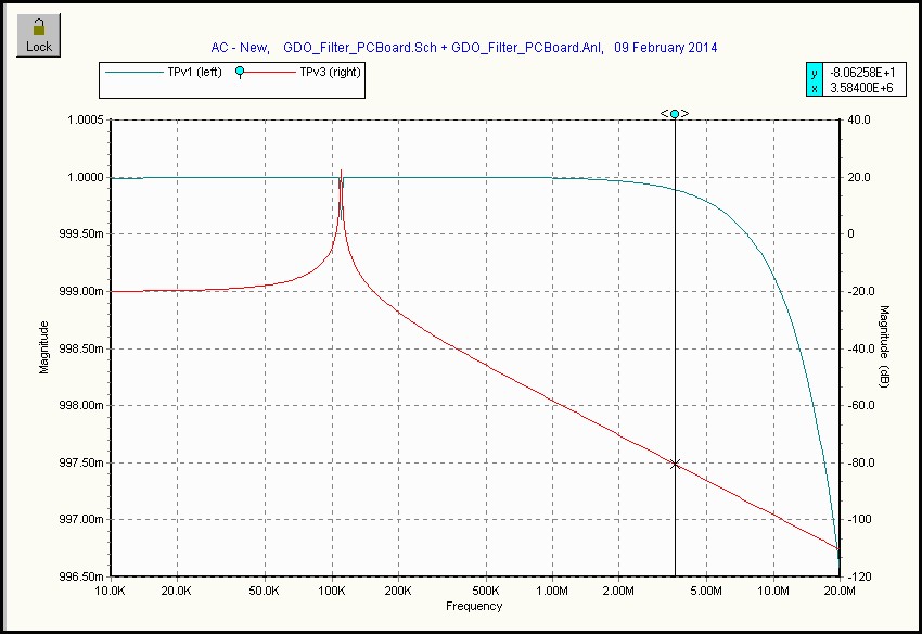 Compare the attenuation of this smaller filter with the original filter above. The output attenuation, -80dB, is almost identical to the