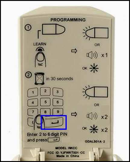 Summarizing the installation "video" and the above Installation Manual gives the following steps:1) Press the "LEARN" button on the Guardian 628 operator - you will have 30 secs to program the WKCC; 2) Enter a four-to-six digit code, then press "Enter". The button is shown highlighted in "BLUE" 3) The light on the Guardian 628 will flash and 'beep' twice. 4) Programming is complete. Next time the correct code is entered, the door will go up (if down) or down (if up). Note that even if the garage door is "locked" (sliding the control lever on the wall control unit to "lock"), the garage door will OPEN if the correct code is entered on the keypad! So keep the code private! |