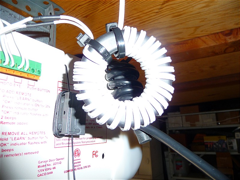 less noisy and requires no maintenance. Specs for the unit: 3/4 HP DC Motor 200W Lighting Electronic Limits <- great feature; eliminates travel limit switches Installer Force Adjustments <- allows for precise adjustment of closing force 5-Year Motor Warranty Interchangeable Integrated Rail Systems Now the 'bad-stuff'. I found the garage door wide open the next morning after the installation. I was on-the-air in the evening and the RF field must have falsed the GDO's logic board and caused it to open. I didn't know it was open all night. Not a good thing! Further testing confirmed that the GDO would consistently false (open or close) using low power RF SSB (150W) on 75 and 20 mtrs. That amazed me b/c it is digital and has rolling code technology. So how can an RF SSB envelope look like a 32 bit rolling code?? To false the GDO, I only needed to give my call sign and/or use the CW tuner (60wpm) to cause the door to open or close. That shouldn't be possible. There has to be another explanation. As I started the investigation into "what-is-the-main-culprit", I found that unplugging the wall-switch wire completely stopped the falsing! The GDO would still operate perfectly with the remote control. And try as I might, even with 1KW transmit energy, it would not false! This finding was expected b/c any unshielded long wire will act as an antenna. In my case, it required that the full length of the supplied connecting wire be used, some 50'. When a long wire such as this is exposed to an RF field, it WILL cause problems in any device not specifically treated to be immune to RF. So we now know the RF entry point. Next is how do I fix it? |