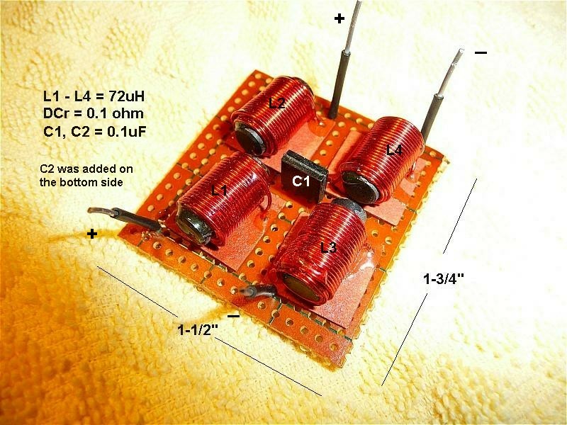 perfect for this task b/c they have high inductance with very low DCR (0.04 ohms). Two of these wired in series produce a 45uH choke with