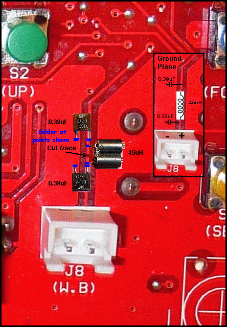 is the Logic Board's ground plane so only the "+" side would need RFI parts.The parts (45uH choke w/ low DCR and two disc ceramic caps, 0.39uF) incorporated where shown would eliminate the RFI problem giving apx -80dB attenuation to any RF signal. The picture shows the scale of the added parts; apx 1:1 size in relation to the pc board. The inset shows the electrical schematic for the added parts. This means that the Logic Board's artwork should be modified to incorporate the RFI filter. This would ONLY be feasible if it needed updating for other reasons. The filter parts could be included at that time at minuscule cost. |