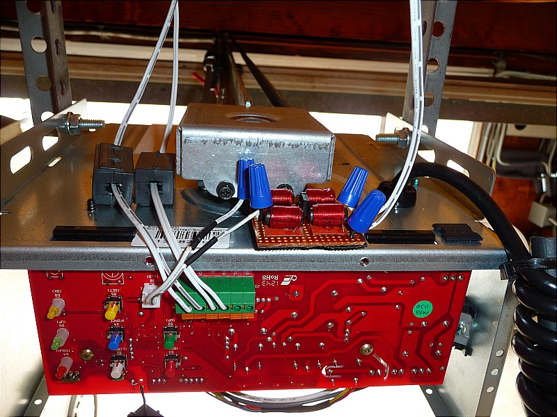 is not feasible. So plan "B" was used.Here the Filter Board was mounted on top and held down with Velco strip. This is the simplest way to do it and makes it "almost" invisible. The GDO + new filter were tested on 75 and 20mtrs @ 1.5 KWatt level with a random door-false every once in awhile. So an additional capacitor was added (C2) for extra attenuation. After that, the door could not be falsed. |