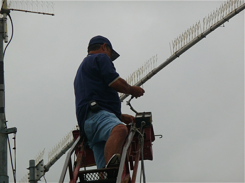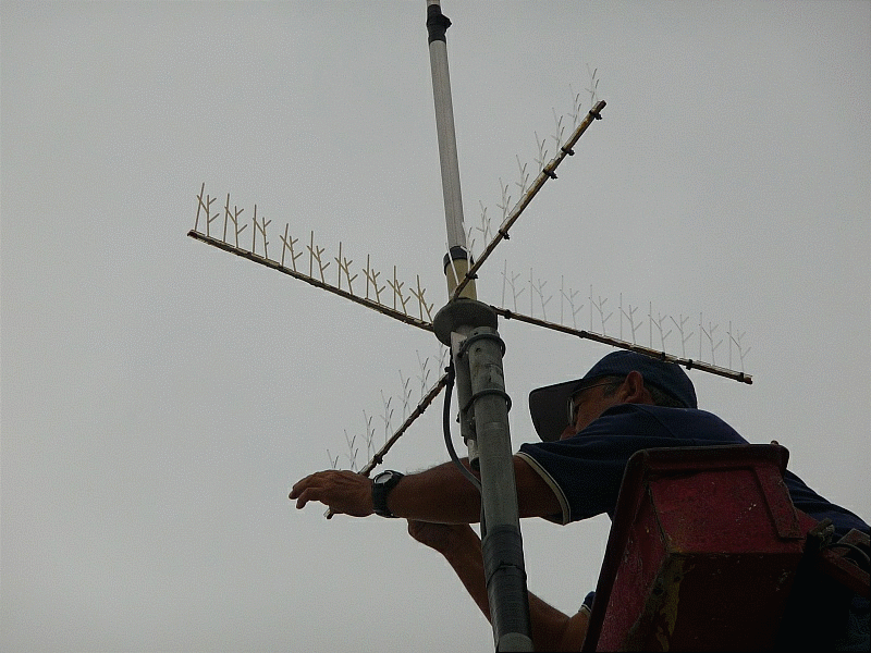 This picture shows Bill replacing the Bird Spikes on the G6-144 colinear. The 3 years since it was put up have taken a toll on the both antennas but especially the colinear so that two (2) of the radials were bare! I thought that the Bird Spikes would have lasted much longer on that antenna but I guess the small radial size caused the bird spikes to work loose and come off. Of course, the starlings gathered there throughout the day doing their thing . . . singing and crapping! |